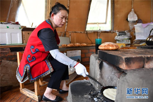 杜峰在位于敖魯古雅鄂溫克族鄉(xiāng)的鄂庫(kù)娜列巴房?jī)?nèi)烤列巴(7月14日攝)。 新華社記者 貝赫 攝