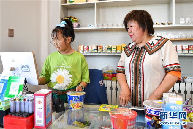 索云(右)在位于敖魯古雅鄂溫克族鄉(xiāng)的自家超市內(nèi),指導(dǎo)女兒為顧客結(jié)賬(7月14日攝)。 新華社記者 貝赫 攝