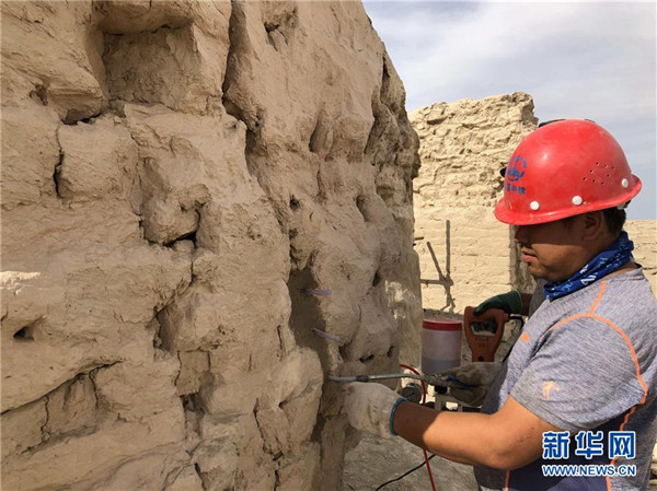 這是搶險加固中的樓蘭古城三間房遺址(7月27日攝,手機照片)。新華社發(fā)(中鐵西北科學(xué)研究院有限公司提供)