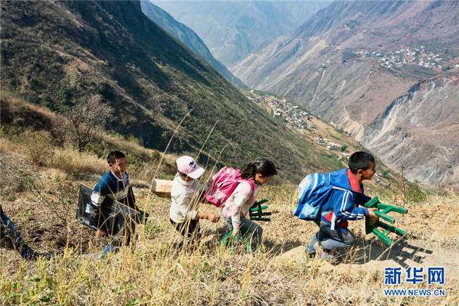 李本艷姐弟倆從家門口沿著崎嶇的山路走到學(xué)校,要近兩個(gè)小時(shí),每走一步,腳下都是數(shù)百米高的懸崖。搬家后,姐弟倆帶著書包和小板凳離開(kāi)(攝于4月1日)。新華網(wǎng)發(fā)(鮑禹 攝)
