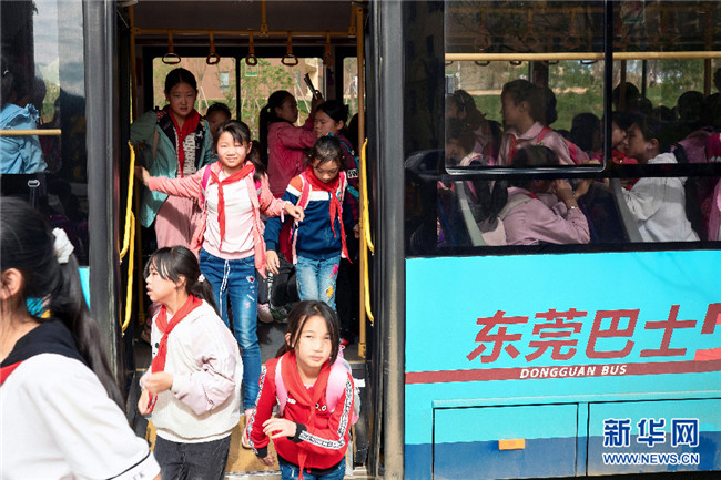 如今,李本艷姐弟倆從卯家灣家門口坐上東莞愛(ài)心巴士,25分鐘就可到學(xué)校(攝于7月3日)。新華網(wǎng)發(fā)(鮑禹 攝)