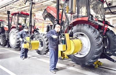 中國一拖員工在總裝車間流水線上作業(yè)。記者 李嘉南 攝
