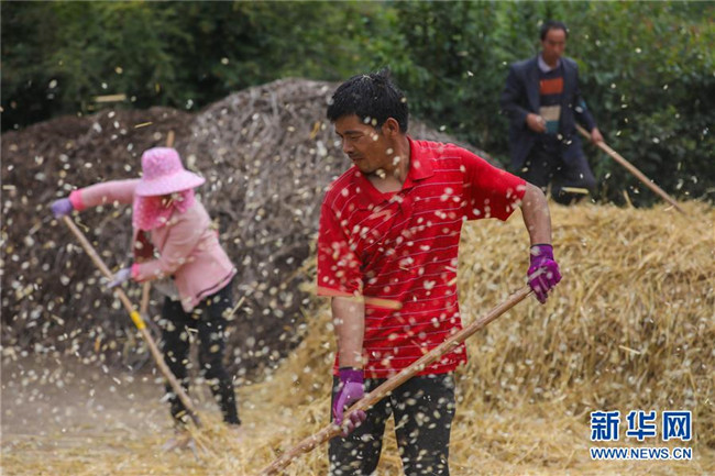 8月22日,元古堆村村民在脫麥子。 目前,在甘肅省定西市渭源縣元古堆村,村民正忙著脫麥子。當(dāng)?shù)胤N植的590多畝冬小麥近日喜獲豐收。 新華社記者 馬希平 攝