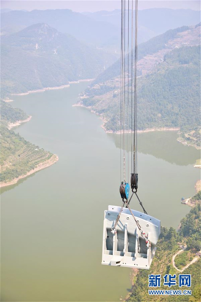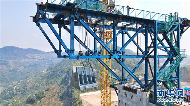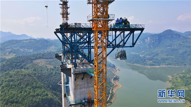 9月1日,工作人員在對主索鞍進行吊裝(無人機照片)。新華社記者劉續(xù)攝