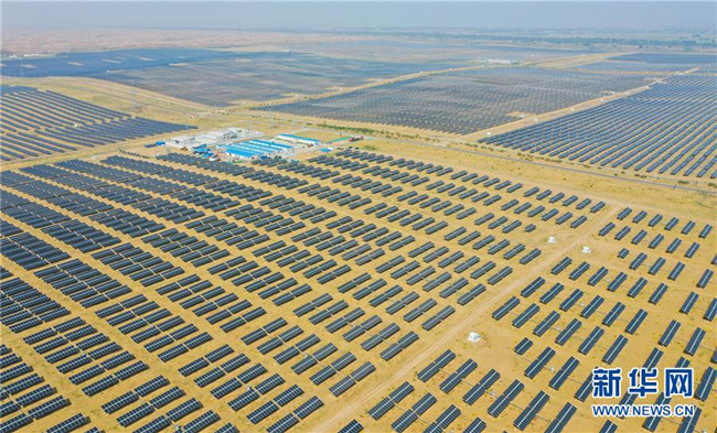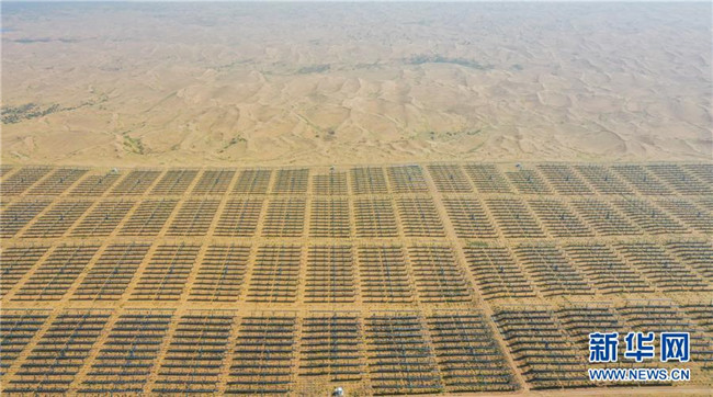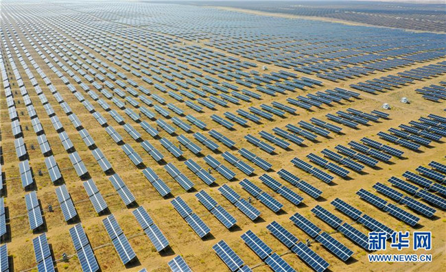 日前,由中建中環(huán)工程有限公司承建的內(nèi)蒙古達(dá)拉特旗光伏發(fā)電領(lǐng)跑獎(jiǎng)勵(lì)基地1號(hào)項(xiàng)目順利建成完工,該項(xiàng)目位于庫布其沙漠中,建成后與基地內(nèi)一期光伏電站連成一體,占地面積約120萬平方米。 新華社記者 連振 攝