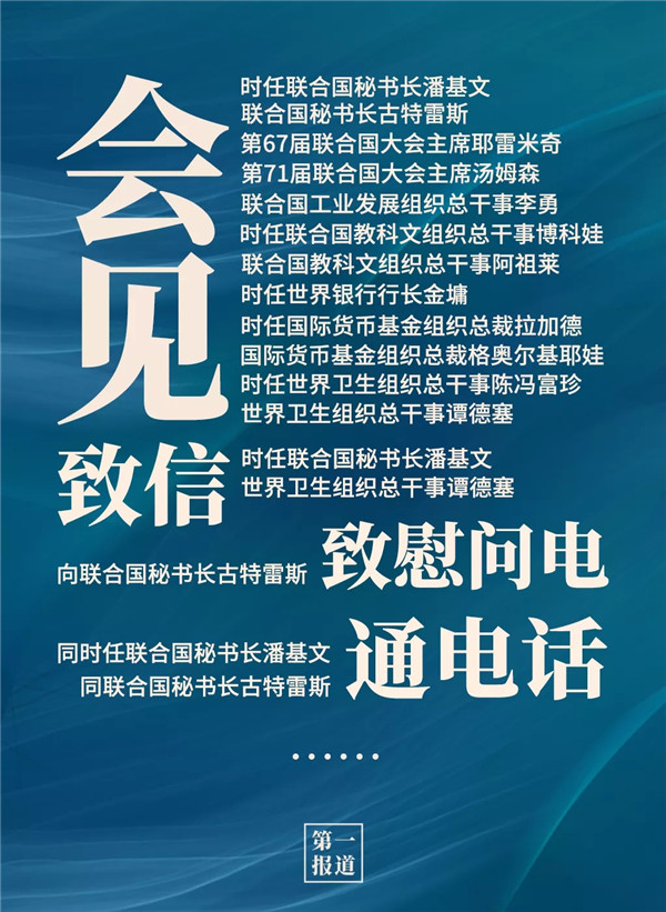 2013年以來,習(xí)主席通過會(huì)見、通話、致信函等多種方式同聯(lián)合國主要官員保持密切溝通。互動(dòng)對象包括聯(lián)合國秘書長、聯(lián)合國大會(huì)主席,還有聯(lián)合國工業(yè)發(fā)展組織、聯(lián)合國教科文組織、世界銀行、國際貨幣基金組織、世界衛(wèi)生組織等聯(lián)合國專門機(jī)構(gòu)主要負(fù)責(zé)人。