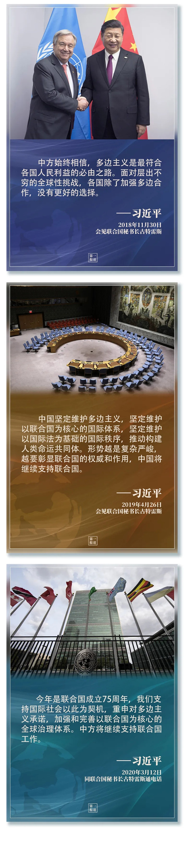 習(xí)主席指出,“支持聯(lián)合國發(fā)揮作用,維護(hù)聯(lián)合國權(quán)威和地位,是中國外交一項(xiàng)基本政策。”2013年以來,習(xí)主席多次會(huì)見聯(lián)合國主要官員,訪問聯(lián)合國總部及聯(lián)合國專門機(jī)構(gòu),出席一系列聯(lián)合國活動(dòng)……親自推動(dòng)中國同聯(lián)合國的合作,發(fā)出支持聯(lián)合國事業(yè)、捍衛(wèi)多邊主義的中國強(qiáng)音。