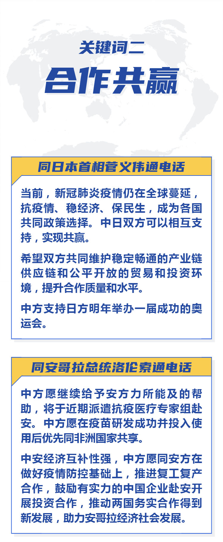 習(xí)近平指出,面對(duì)新冠肺炎疫情,中安兩國(guó)政府都本著人民至上、生命至上原則,采取堅(jiān)決、果斷措施,有效控制了疫情蔓延。雙方相互支持、相互幫助,兩國(guó)在對(duì)方國(guó)家的僑民都得到了很好照顧。中方愿繼續(xù)給予安方力所能及的幫助,將于近期派遣抗疫醫(yī)療專家組赴安。中方愿在疫苗研發(fā)成功并投入使用后優(yōu)先同非洲國(guó)家共享。