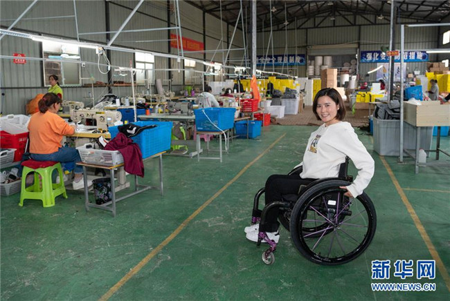 10月13日,在湖南省邵陽市城步縣湖南七七科技股份有限公司生產(chǎn)車間,殘疾女青年楊淑亭(前排中)與工友合影。1991年出生的苗族姑娘楊淑亭因車禍胸部以下高位截癱,通過不斷學(xué)習(xí)摸索,開辦網(wǎng)店并注冊(cè)了自己的企業(yè),與周邊貧困家庭簽訂合作協(xié)議,制作售賣具有民族特色的背包和仿真花卉,帶動(dòng)上千名貧困人員及59名殘疾人就業(yè)。