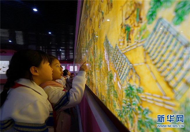 10月19日,小學(xué)生們?cè)谥袊鵀粗萜び安┪镳^內(nèi)參觀一幅皮影長卷。新華社記者 牟宇 攝