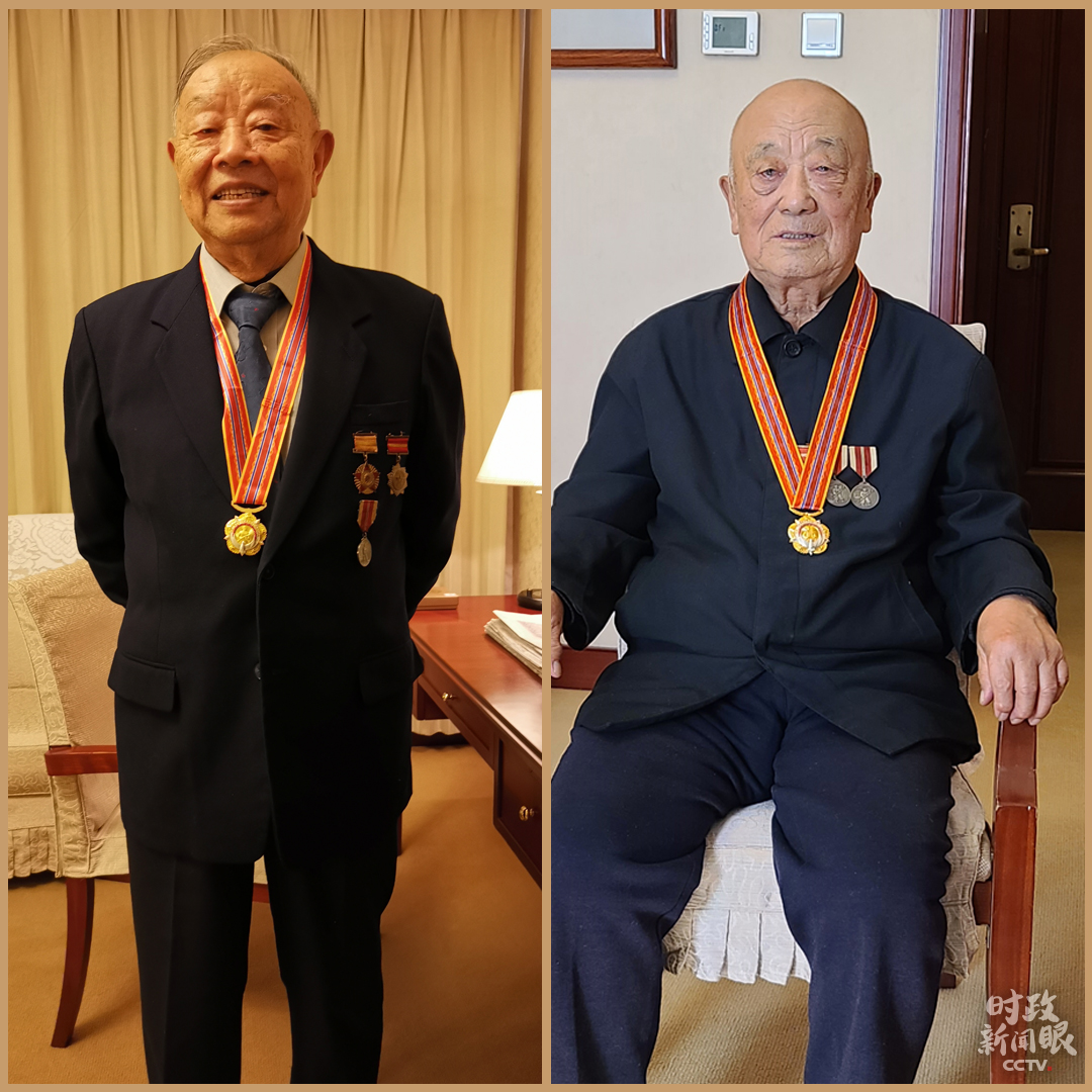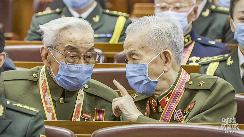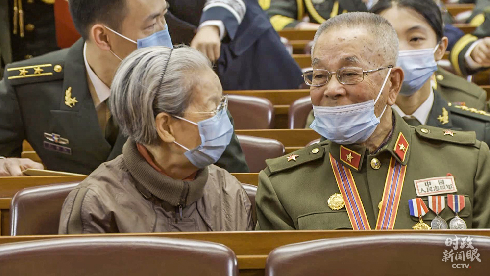 △今年86歲的張?jiān)埽ㄗ螅﹨⒓舆^(guò)上甘嶺戰(zhàn)役,榮獲三等功2次,90歲的王德啟(右)在抗美援朝期間榮立三等功4次。他們都出席了當(dāng)天的紀(jì)念大會(huì)。(總臺(tái)央視記者王曉東、趙化拍攝)