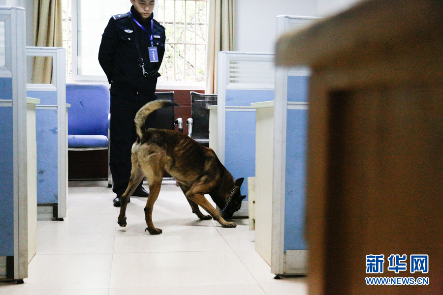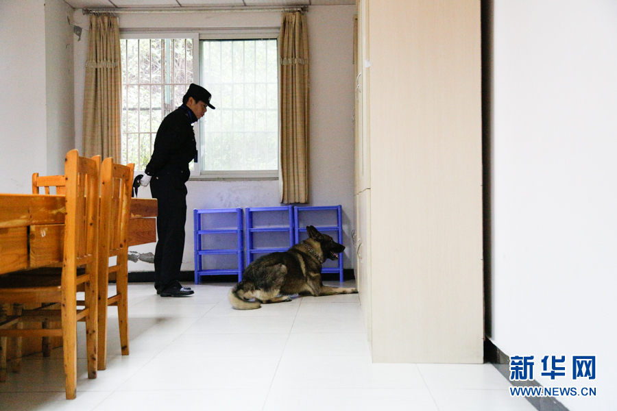 警犬正在房間內搜索可疑物品。新華網發(fā)(耿駿宇 攝)