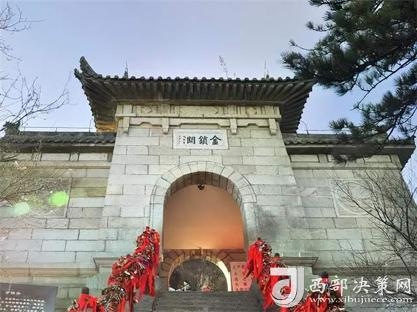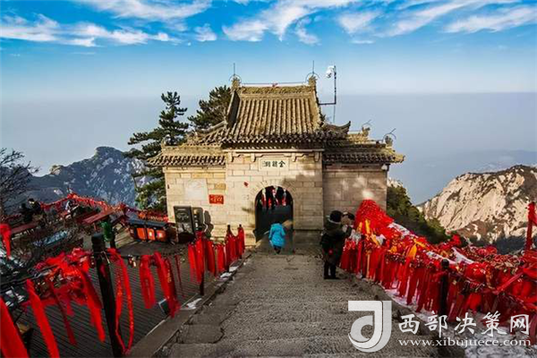 金鎖關(guān)是建在三峰口的一座城樓般石拱門,是經(jīng)五云峰通往東西南峰的咽喉要道,鎖關(guān)后則無(wú)路可通。杜甫《望岳》詩(shī)中“箭栝通天有一門”就是指的這里。道家認(rèn)為,華岳為仙鄉(xiāng)神府,只有過了通天門,才算進(jìn)入仙境。所以有“過了金鎖關(guān),另是一重天的”的民謠。