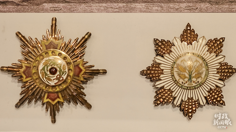 △這是民國政府頒授給張謇的寶光嘉禾勛章(左)和嘉禾勛章(右),以表彰他在實(shí)業(yè)、教育等方面的救國主張和實(shí)踐。(總臺(tái)央視記者彭漢明拍攝)