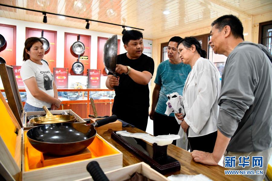 在濟(jì)南市章丘區(qū)三澗溪村美食街,游客在購(gòu)買(mǎi)章丘鐵鍋(6月23日攝)。新華社記者 郭緒雷 攝