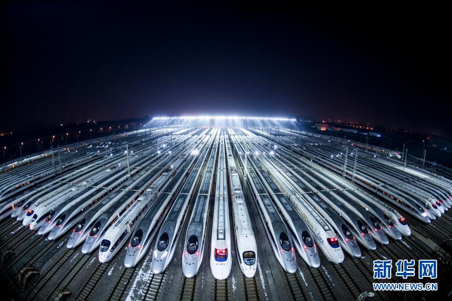 動車組停靠在武漢動車段的存車線上,準備進行檢修和保溫作業(yè)(2018年2月1日攝)。新華社記者 肖藝九 攝