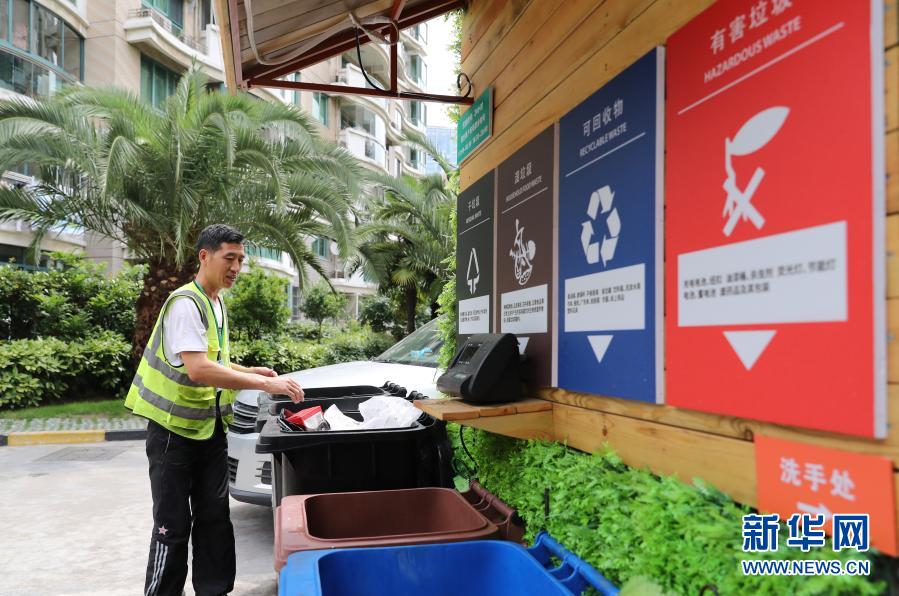 在上海市虹口區(qū)嘉興路街道一處小區(qū),保潔工對居民分類投放的生活垃圾進行分揀(2019年6月24日攝)。新華社記者 方喆 攝