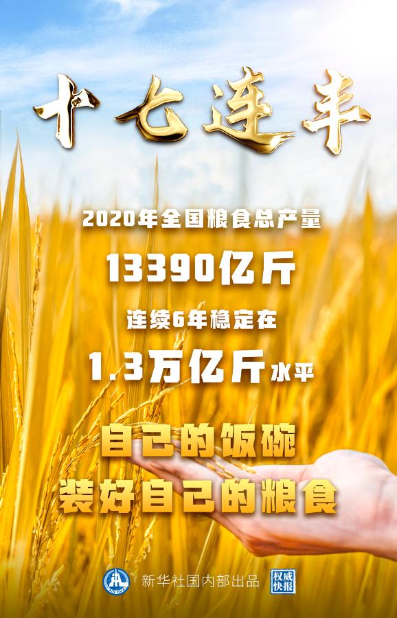 我國糧食生產(chǎn)實現(xiàn)“十七連豐”。國家統(tǒng)計局10日發(fā)布數(shù)據(jù),2020年全國糧食總產(chǎn)量為13390億斤,比上年增加113億斤,增長0.9%,連續(xù)6年保持在1.3萬億斤以上。