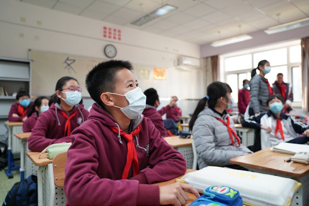 6月1日,北京小學兩位返校復課的六年級學生進入學校時向老師招手示意。
