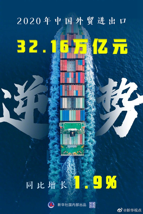 新華社北京1月14日電(記者劉紅霞)海關(guān)總署14日發(fā)布數(shù)據(jù),2020年我國貨物貿(mào)易進(jìn)出口總值32.16萬億元,同比增長1.9%,在新冠肺炎疫情和單邊主義保護(hù)主義等多重壓力之下創(chuàng)歷史新高,成為全球唯一實(shí)現(xiàn)貨物貿(mào)易正增長的主要經(jīng)濟(jì)體。