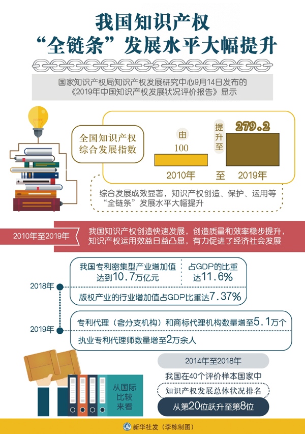 科技創(chuàng)新的時(shí)代大潮奔騰不息。除了高鐵這張響亮的名片,我國(guó)在信息通信、航空航天、核能等領(lǐng)域也已形成一批擁有自主知識(shí)產(chǎn)權(quán)的核心技術(shù),一次又一次刷新著我國(guó)高科技領(lǐng)域知識(shí)產(chǎn)權(quán)的紀(jì)錄。2020年底,世界知識(shí)產(chǎn)權(quán)組織發(fā)布的《2020年全球創(chuàng)新指數(shù)》報(bào)告顯示,在全球131個(gè)經(jīng)濟(jì)體中,中國(guó)的創(chuàng)新能力持續(xù)位居世界前15行列,是躋身綜合排名前30位的唯一中等收入經(jīng)濟(jì)體。我國(guó)商標(biāo)申請(qǐng)量、發(fā)明專(zhuān)利申請(qǐng)量連續(xù)多年位居世界首位;我國(guó)著作權(quán)產(chǎn)業(yè)在國(guó)民經(jīng)濟(jì)中的比重連年提升,2019年達(dá)到7.39%。