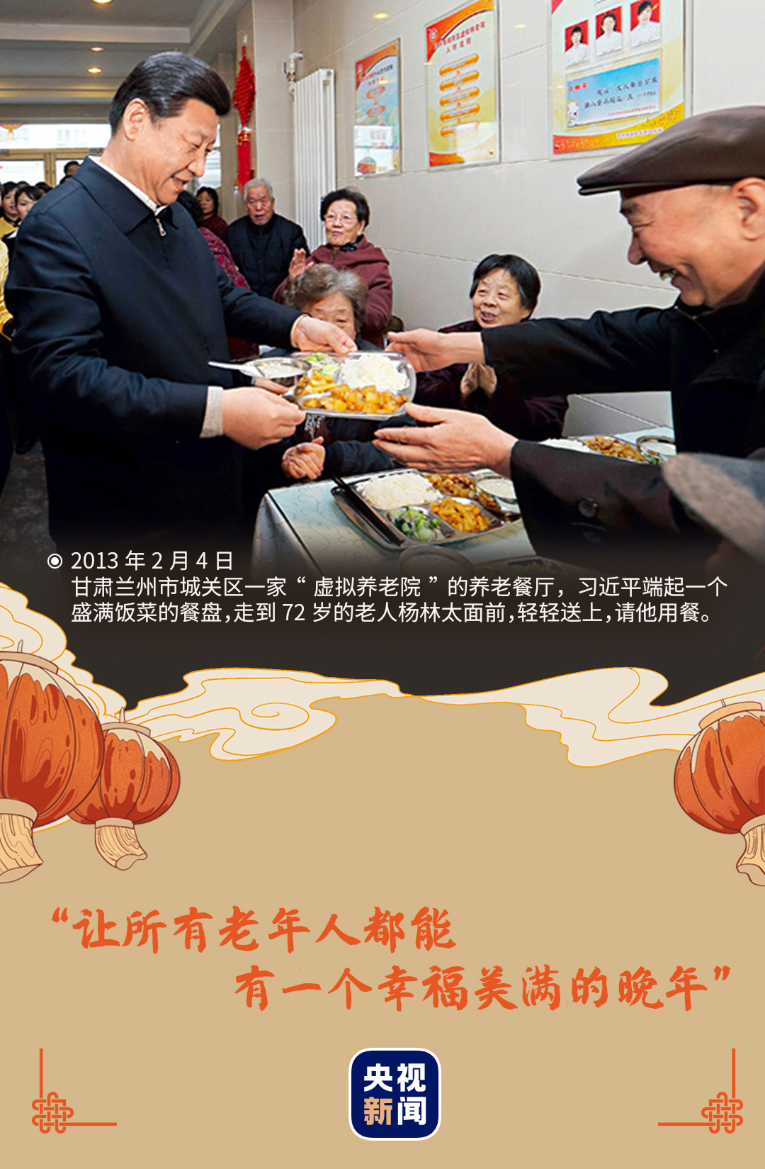 在各地考察中,習近平一次次走進鄉(xiāng)村、社區(qū)、養(yǎng)老機構(gòu)和養(yǎng)老服務(wù)站,與老人們親切交流,叮囑要給予他們更多關(guān)心。在蘭州“虛擬養(yǎng)老院”的養(yǎng)老餐廳,總書記親自給老人遞飯菜;在北京四季青敬老院,總書記觀看老人作畫、手工制作、排練合唱等,祝福他們健康長壽……