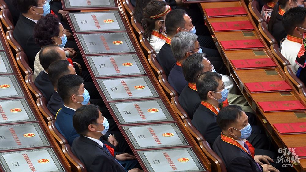 △大會(huì)當(dāng)天,“全國(guó)脫貧攻堅(jiān)楷模”榮譽(yù)稱號(hào)獲獎(jiǎng)?wù)叽硎苎谥飨_(tái)就座。(總臺(tái)央視記者鐘鋒拍攝)