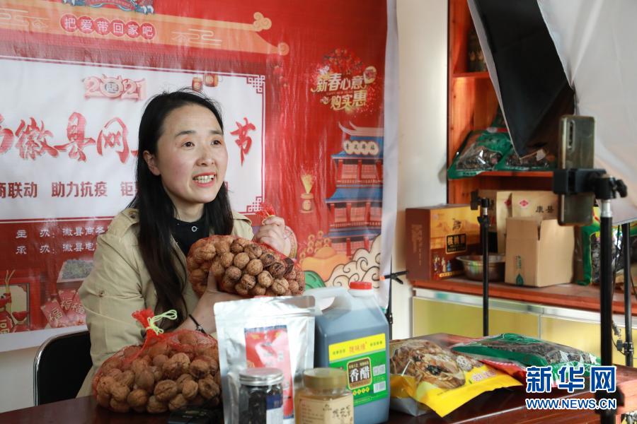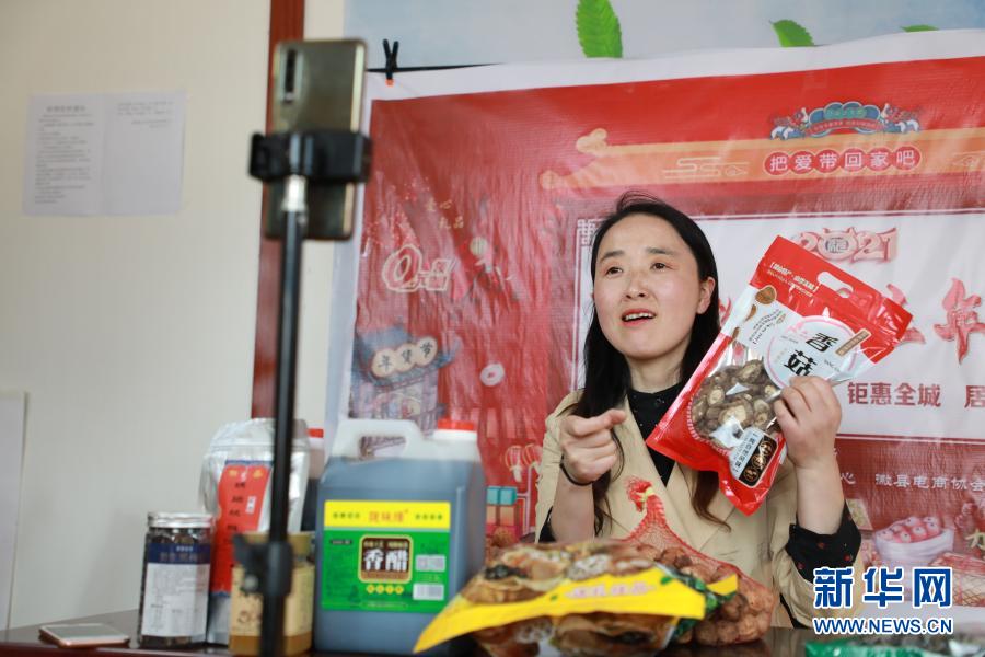 2月23日,在位于甘肅隴南市徽縣的店鋪中,全國人大代表梁倩娟在網(wǎng)上直播銷售當(dāng)?shù)剞r(nóng)特產(chǎn)品?!⌒氯A社記者 張智敏 攝