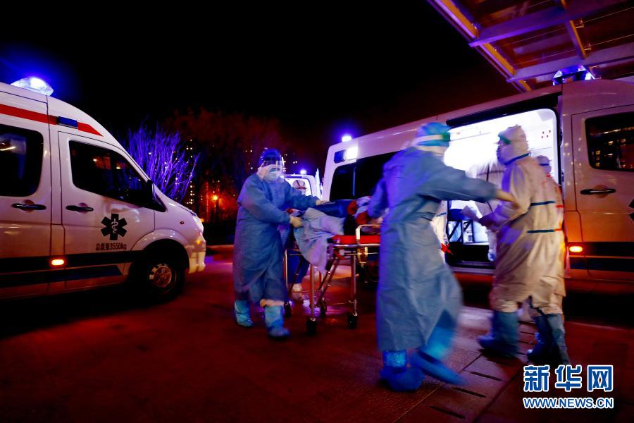 在武漢泰康同濟(jì)醫(yī)院接診大廳外,軍隊(duì)支援湖北醫(yī)療隊(duì)隊(duì)員接收轉(zhuǎn)運(yùn)來的患者(2020年3月14日攝)。新華社發(fā)(王皓宇 攝)