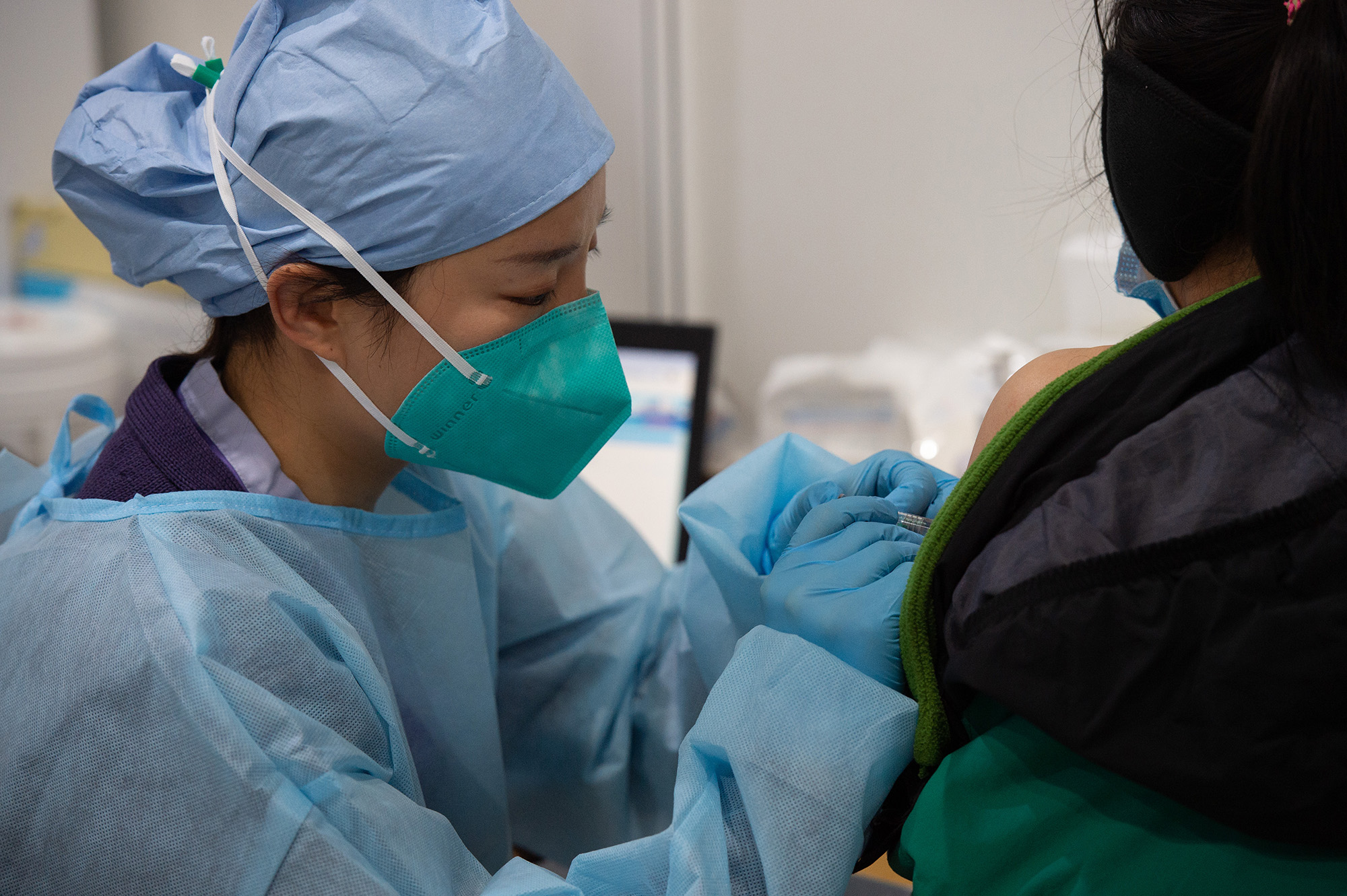 ↑2021年1月2日,在北京市朝陽區(qū)一臨時接種點,醫(yī)護人員為接種人員注射新冠病毒疫苗。