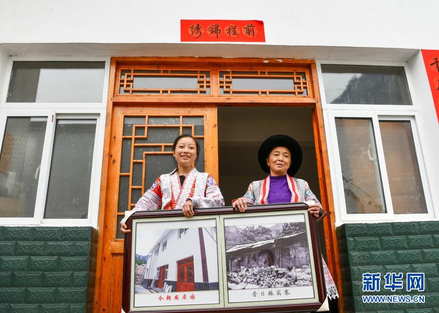 2月20日,在貴州省畢節(jié)市黔西縣新仁苗族鄉(xiāng)化屋村麻窩寨易地扶貧搬遷集中安置點,苗族女孩王代玉(左)與母親楊文梅在自家新房前展示易地扶貧搬遷前后的對比照片。近年來,化屋村在實施易地扶貧搬遷的同時,大力發(fā)展特色種植、養(yǎng)殖、旅游等產(chǎn)業(yè),村里迎來跨越式發(fā)展。 新華社記者 楊文斌 攝