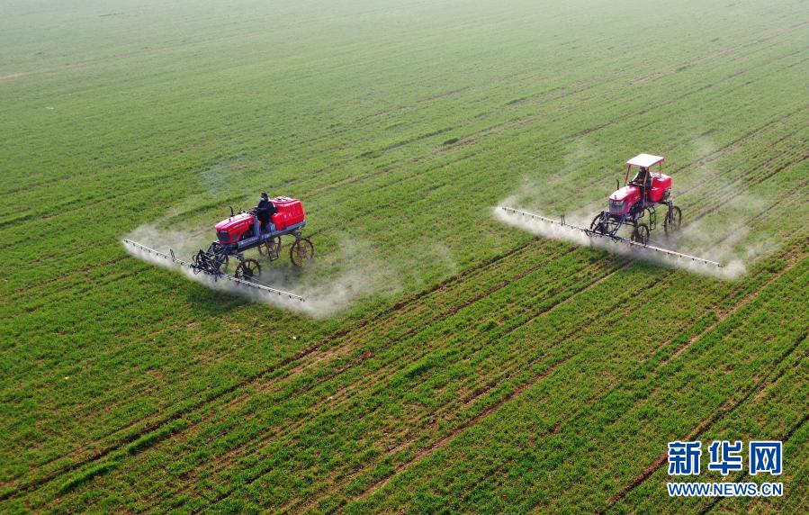 3月5日,河北省邢臺市南和區(qū)閻里鄉(xiāng)閻里村農(nóng)民操作農(nóng)業(yè)機械在麥田噴灑農(nóng)藥(無人機照片)。新華社記者 朱旭東 攝