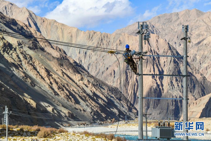 在新疆塔什庫爾干塔吉克自治縣的深山中,工人在調(diào)節(jié)一處入戶線路的松緊度(2019年11月23日攝)。為了解決供電難題,新疆加大投入,實施光伏供電村電網(wǎng)延伸工程,惠及偏遠村莊。 新華社記者 胡虎虎 攝