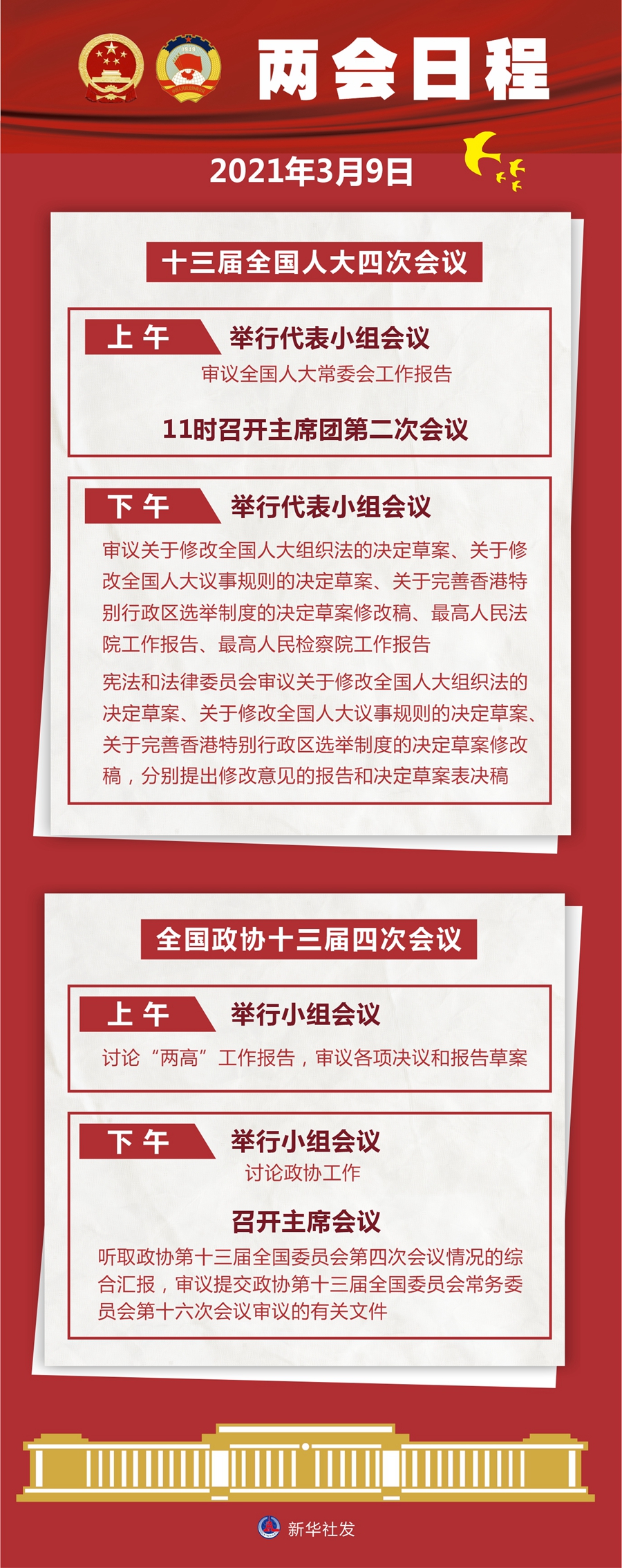 十三屆全國人大四次會議9日上午舉行代表小組會議,審議全國人大常委會工作報告;11時召開主席團第二次會議。下午舉行代表小組會議,審議關(guān)于修改全國人大組織法的決定草案、關(guān)于修改全國人大議事規(guī)則的決定草案、關(guān)于完善香港特別行政區(qū)選舉制度的決定草案修改稿、最高人民法院工作報告、最高人民檢察院工作報告;憲法和法律委員會審議關(guān)于修改全國人大組織法的決定草案、關(guān)于修改全國人大議事規(guī)則的決定草案、關(guān)于完善香港特別行政區(qū)選舉制度的決定草案修改稿,分別提出修改意見的報告和決定草案表決稿。