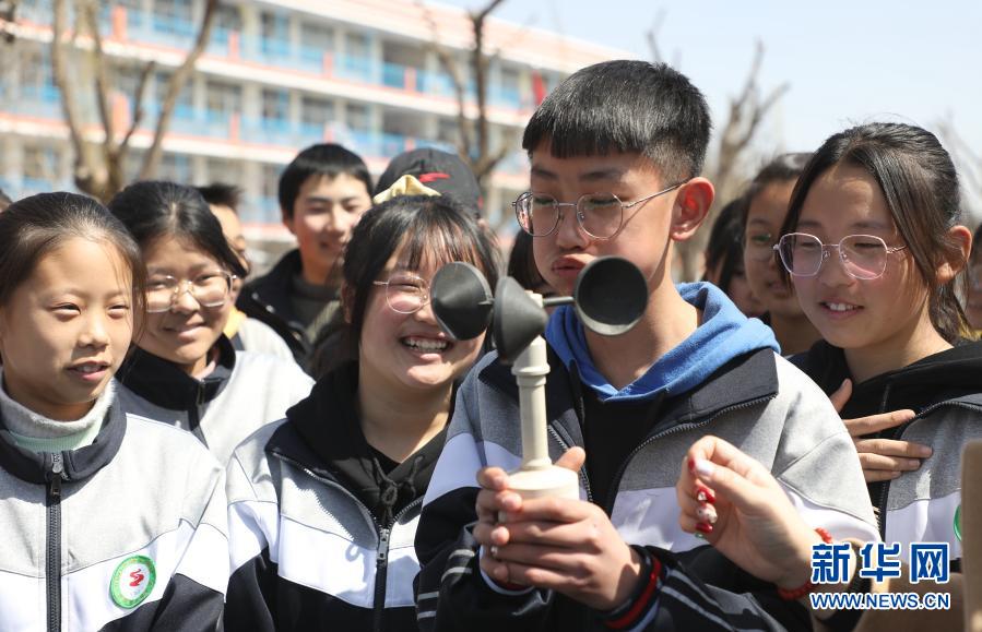 3月22日,山東省臨沂市沂南縣孫祖鎮(zhèn)中學(xué)一名學(xué)生在做風(fēng)速實驗。新華社發(fā)(杜昱葆 攝)