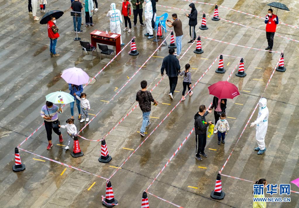 4月6日,在瑞麗市目瑙社區(qū)一核酸檢測點(diǎn),當(dāng)?shù)鼐用裢ㄟ^設(shè)置的通道排隊(duì)采樣。新華社記者 陳欣波 攝
