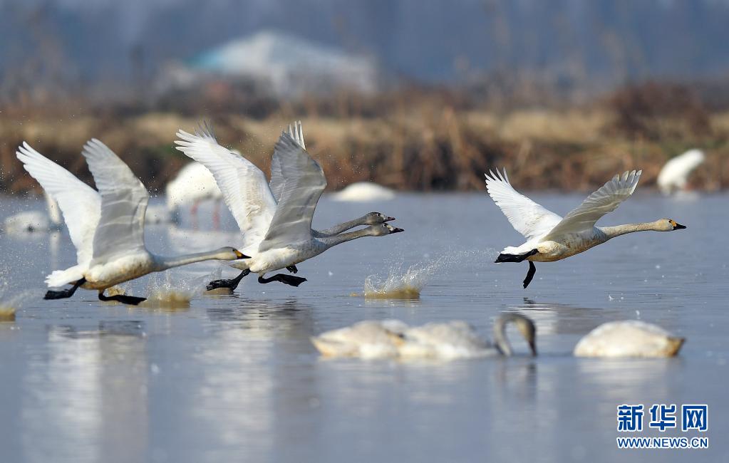 候鳥在位于江西鄱陽湖畔的五星農(nóng)場(chǎng)境內(nèi)振翅起飛(2018年1月11日攝)。新華社記者 萬象 攝