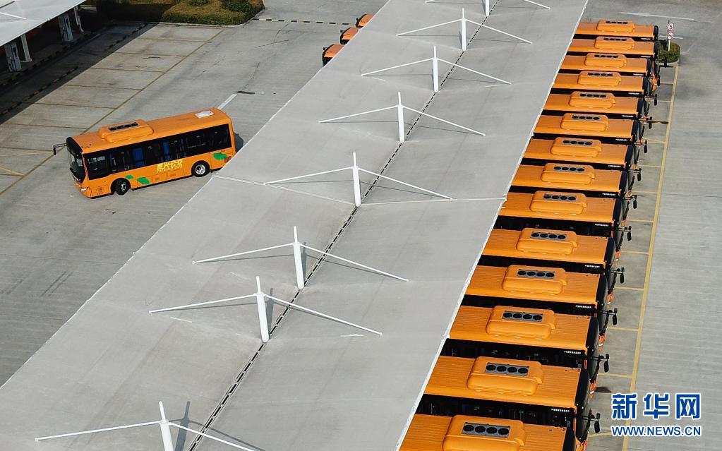 在江蘇省泰興市公交總站,一輛純電動(dòng)公交車入站充電(2018年11月10日攝,無人機(jī)照片)。新華社記者 季春鵬 攝