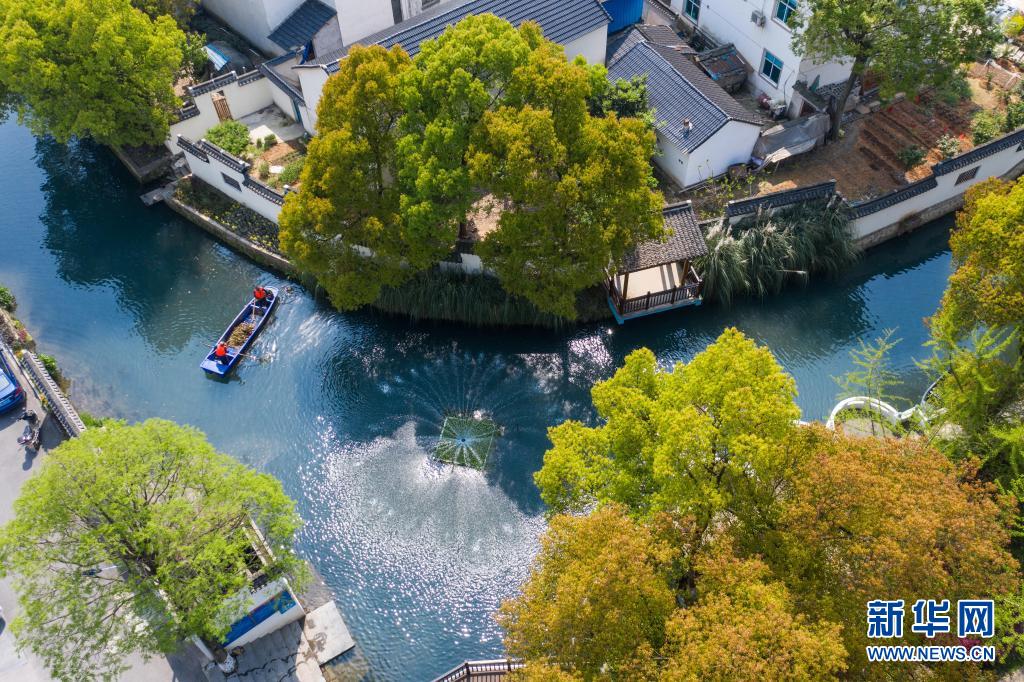 浙江省長(zhǎng)興縣龍山街道渚山村,保潔人員進(jìn)行日常河道護(hù)理巡查(2020年4月9日攝,無人機(jī)照片)。新華社記者 徐昱 攝