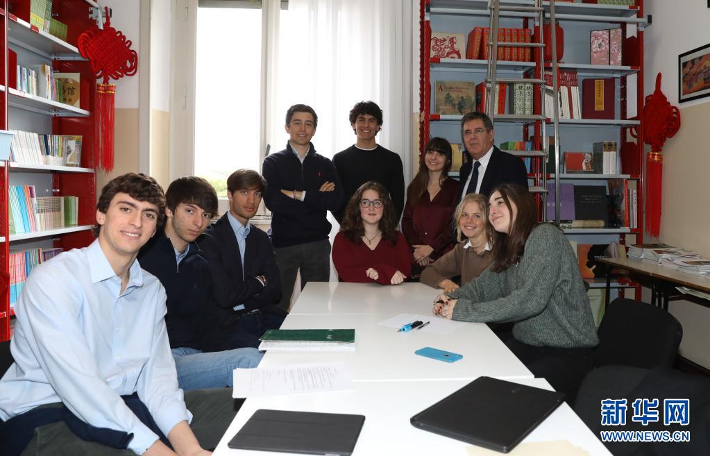 意大利羅馬國立住讀學校校長雷亞萊(后排右一)與致信習近平主席的學生們在一起(2019年3月18日攝)。新華社記者 程婷婷 攝