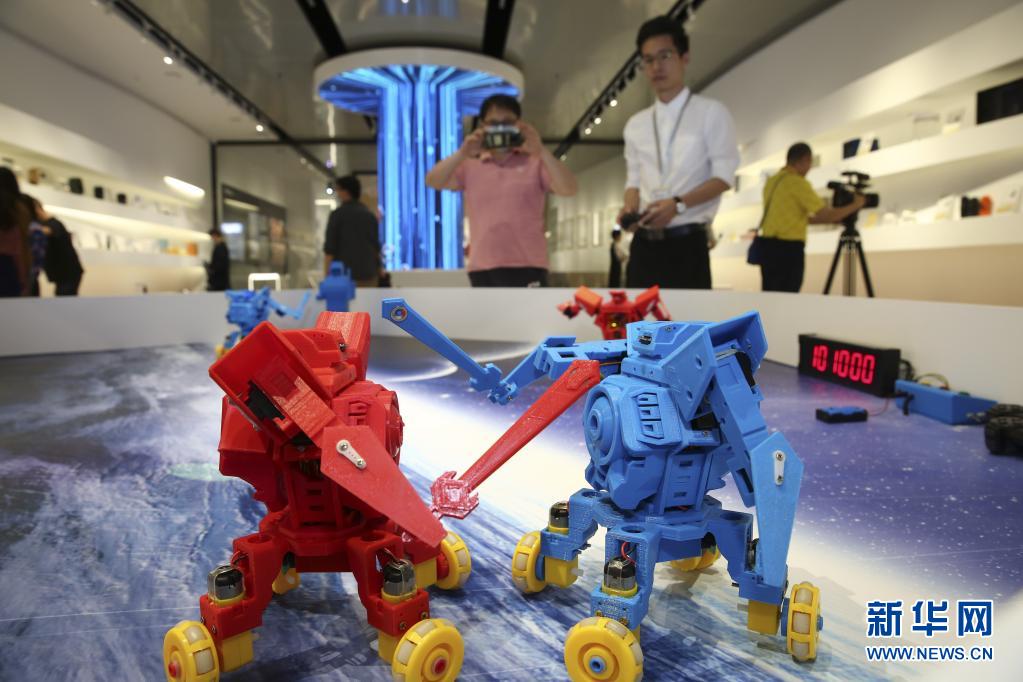 在廣東工業(yè)設計城創(chuàng)新科技館,工作人員在展示機器人“速斗無人區(qū)”(4月19日攝)。新華社記者 殷剛 攝