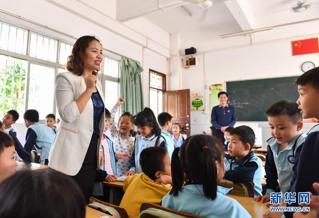 2019年2月20日,米雪梅(左)在中山市沙溪鎮(zhèn)虎遜小學調研時與小學生交流。新華社記者 劉大偉 攝