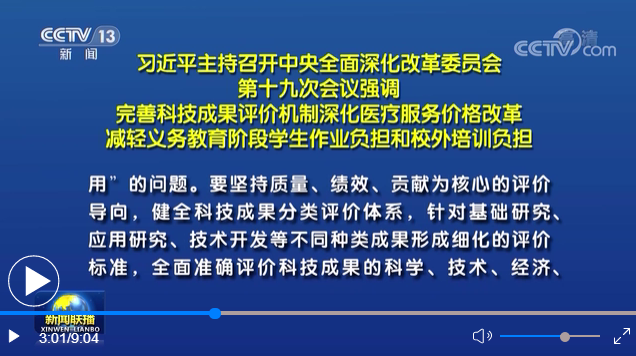 中共中央總書記、國家主席、中央軍委主席、中央全面深化改革委員會(huì)主任習(xí)近平5月21日下午主持召開中央全面深化改革委員會(huì)第十九次會(huì)議,審議通過了《關(guān)于完善科技成果評價(jià)機(jī)制的指導(dǎo)意見》、《關(guān)于進(jìn)一步減輕義務(wù)教育階段學(xué)生作業(yè)負(fù)擔(dān)和校外培訓(xùn)負(fù)擔(dān)的意見》、《深化醫(yī)療服務(wù)價(jià)格改革試點(diǎn)方案》、《關(guān)于深化生態(tài)保護(hù)補(bǔ)償制度改革的意見》、《關(guān)于在城鄉(xiāng)建設(shè)中加強(qiáng)歷史文化保護(hù)傳承的若干意見》。