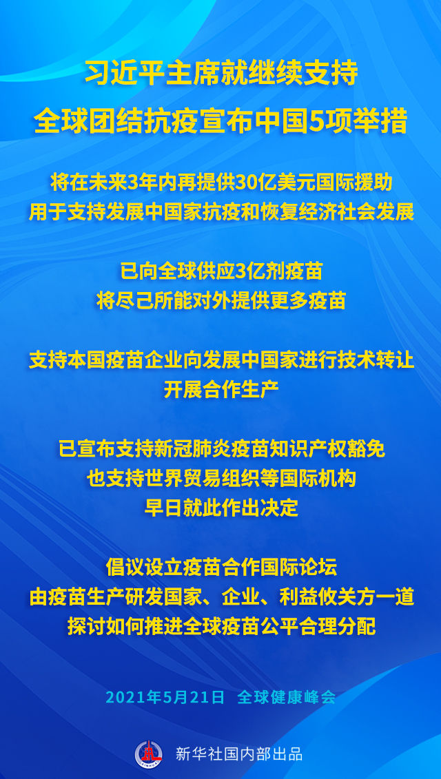 2021年5月,面對全球疫情的起伏反復(fù),著眼全人類共同需求,習(xí)近平主席在全球健康峰會上又提出5點(diǎn)意見、宣布5項新舉措。