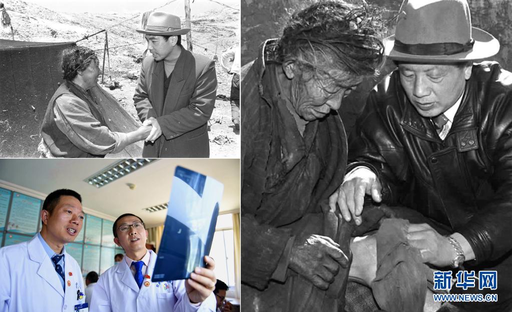 這是一張拼版照片:左上圖為來(lái)自陜西的援藏干部阿里日土縣副縣長(zhǎng)賈冗勇深入牧區(qū),幫助藏族牧民解決生產(chǎn)、生活的實(shí)際困難(新華社記者土登攝 1997年11月11日發(fā));左下圖為2017年8月3日,北京積水潭醫(yī)院援藏醫(yī)生龔曉峰(右)和北京天壇醫(yī)院援藏醫(yī)生李家謀在拉薩市人民醫(yī)院骨科病房?jī)?nèi)查看患者的X光片,進(jìn)行工作交接(新華社記者晉美多吉攝);右圖為孔繁森(右)在阿里日土縣過(guò)巴鄉(xiāng)為孤寡老人益西卓瑪治病(新華社記者土登攝 1994年12月26日發(fā))。新華社發(fā)