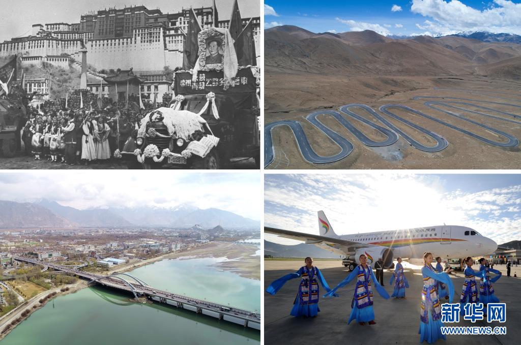 這是一張拼版照片:左上圖為1954年12月25日,康藏(今川藏)、青藏兩條公路通車儀式在布達(dá)拉宮前舉行(資料照片);左下圖為橫跨在拉薩河上的拉薩市區(qū)公路(2019年4月3日新華社記者晉美多吉攝,無(wú)人機(jī)照片);右上圖為通往珠峰的公路(2017年5月19日新華社記者 普布扎西攝);右下圖為西藏航空有限公司成立并舉行首航儀式(2011年7月26日新華社記者覺果攝)。新華社發(fā)