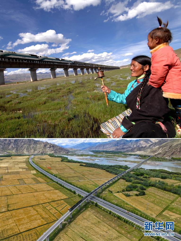 這是一張拼版照片:上圖為西藏當(dāng)雄縣藏族群眾在觀看火車駛過(guò)(2006年6月17日 新華社記者覺果攝);下圖為在西藏拉薩市曲水縣拍攝的公路與鐵路(2016年8月17日新華社記者普布扎西攝 無(wú)人機(jī)照片),西藏已形成了公路、鐵路、航空的立體交通網(wǎng)絡(luò)。新華社發(fā)