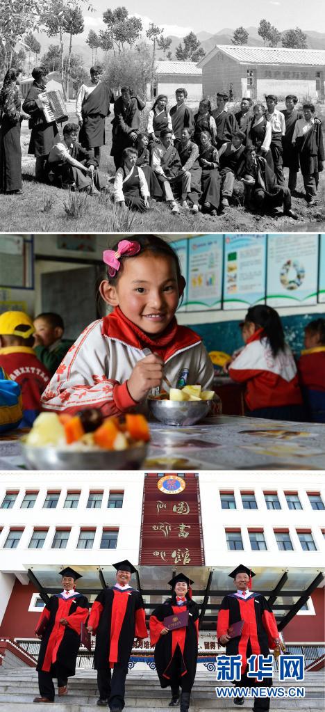 這是一張拼版照片:上圖為拉薩中學(xué)的應(yīng)屆畢業(yè)生在校園里練歌,準(zhǔn)備參加畢業(yè)典禮(新華社記者任用昭攝);中圖為一名藏族女孩在西藏雙湖縣嘎措鄉(xiāng)小學(xué)內(nèi)享受“三包”(包吃、包住、包學(xué)習(xí)費(fèi)用)政策(2014年6月29日新華社記者普布扎西攝);下圖為2017年11月10日,西藏大學(xué)舉行首屆博士研究生畢業(yè)典禮,向4名畢業(yè)生授予博士學(xué)位。這4名博士分別來(lái)自藏族歷史專業(yè)、藏語(yǔ)言文學(xué)專業(yè)及高原醫(yī)學(xué)專業(yè)(新華社記者覺果攝)。新華社發(fā)