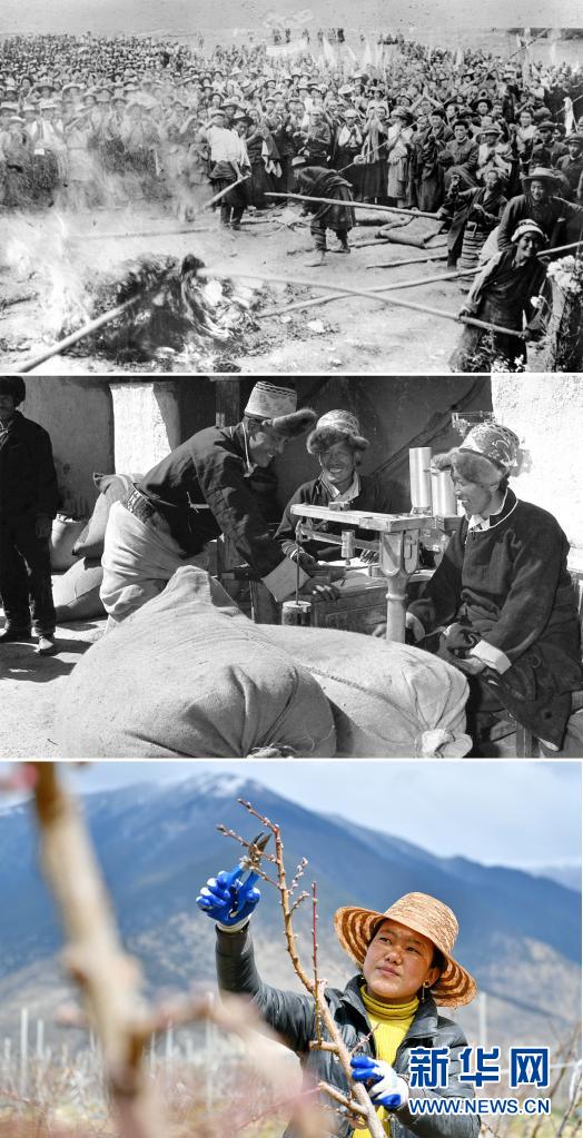 這是一張拼版照片:上圖為1959年8月,西藏墨竹工卡縣的翻身農(nóng)奴焚燒三大領(lǐng)主的剝削文契(新華社發(fā));中圖為1984年,江孜縣農(nóng)民洛桑旺堆(左)向國(guó)家出售余糧。他家承包土地100多畝,農(nóng)忙種地,農(nóng)閑搞建筑、跑運(yùn)輸(新華社記者土登攝);下圖為2020年3月22日,西藏林芝現(xiàn)代蘋果標(biāo)準(zhǔn)化示范園的工作人員為桃樹剪枝。該示范園實(shí)施農(nóng)機(jī)農(nóng)藝結(jié)合、水肥一體化及“果草畜循環(huán)”,大面積推廣蘋果矮砧集約高效栽培技術(shù),帶動(dòng)米林縣羌納鄉(xiāng)林巴、才巴、色沃村及附近的農(nóng)戶增收(新華社記者 張汝鋒 攝)。新華社發(fā)