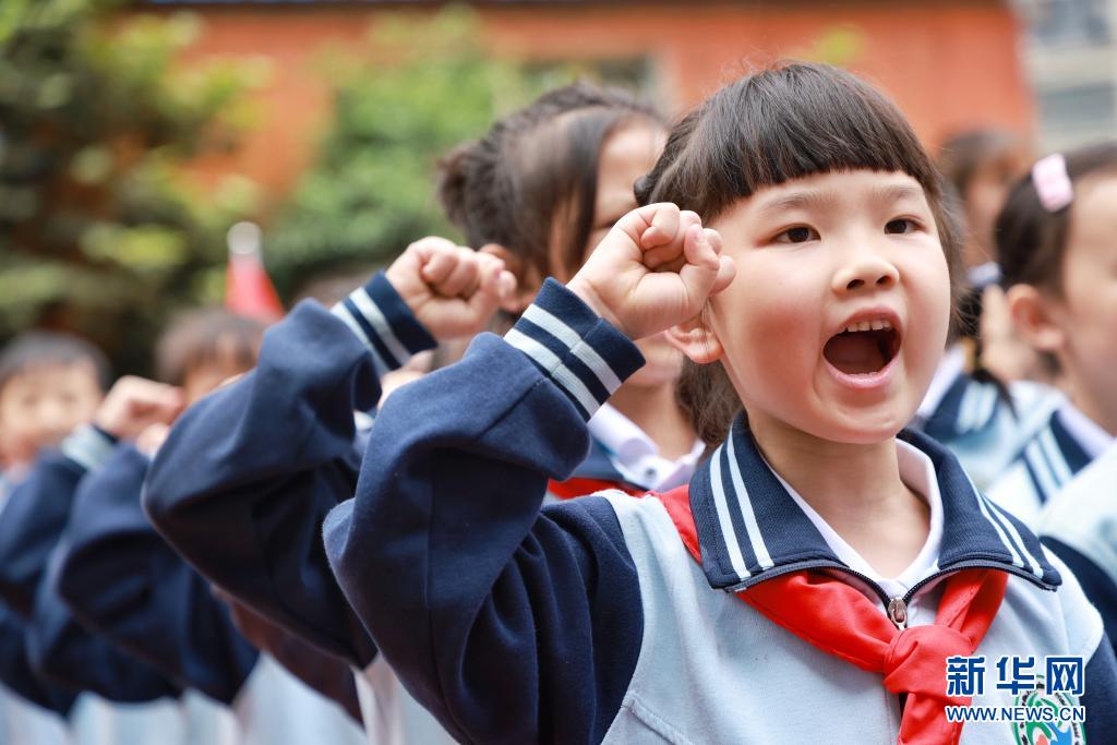 5月31日,少先隊(duì)員們在入隊(duì)儀式上宣誓。新華社記者 劉續(xù) 攝